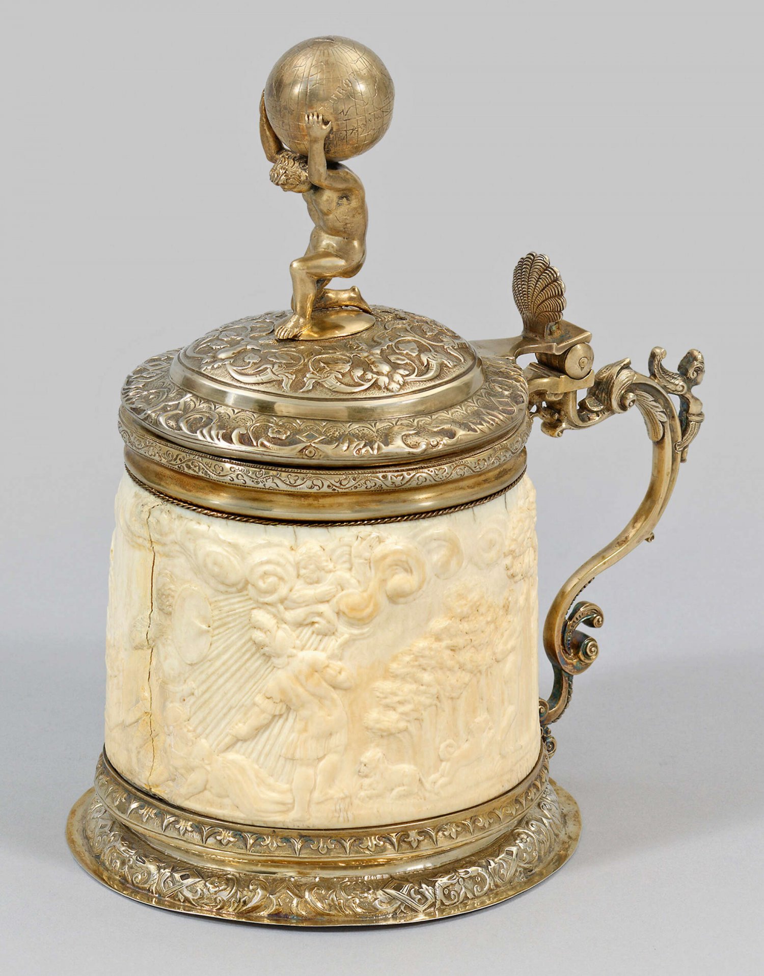Silber, vergoldet. Zweifach gewölbter, ornamentierter Stand. Gering konische Wandung ummantelt von einem sehr fein reliefplastisch geschnittenem Elfenbeinrelief mit alttestamentarischen Darstellungen: Adam und Eva vom Baum der Erkenntnis essend, Kain und Abel vor dem Opferfeuer sowie Kain vor Gott. Flächendeckend von reliefierten Arabesken, Füllhörnern und Fabelwesen umzogener Deckel mit plastischem Knauf in Gestalt von Atlas. Schmaler Volutenhenkel mit muschelförmiger, von einem Elefantenkopf begleiteter Daumenrast. Elfenbein unw. besch.; Gest., Pseudomarken. H. 22 cm.