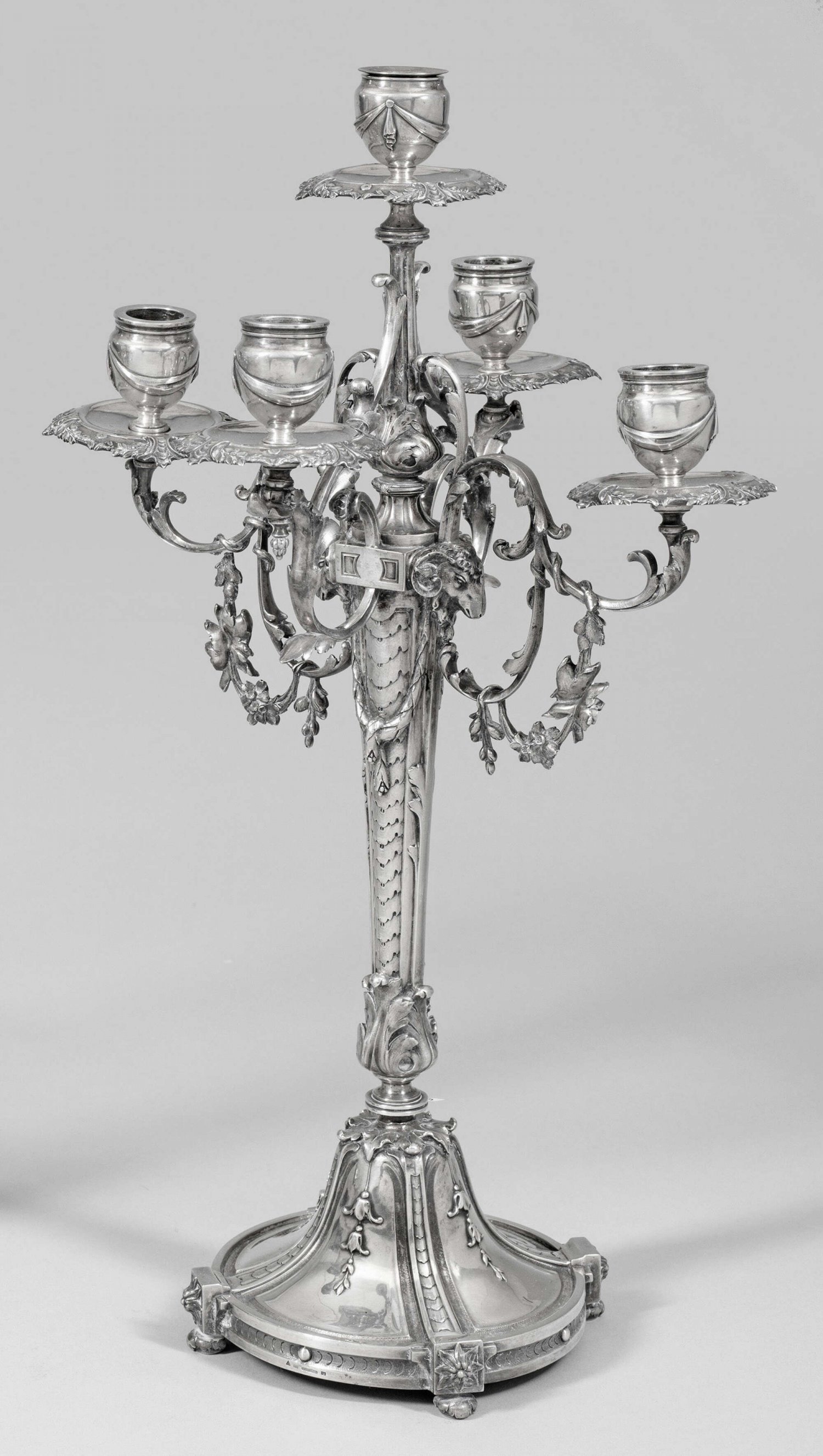 Girandole im Empirestil Silber. 5-flg.; Über glockenartig hochgezogenem Stand hoher, konischer Schaft mit stilisiertem Blattdekor und Widderköpfen. Davon ausgehend gerade bzw. geschweifte Leuchterarme mit plastischem Festonbehang. Vasenförmige Tüllen umzogen von Draperie. Ein Festons minim. besch.; Gest. 800, Herstellerzeichen. Gew. ca. 2550 g. H. 50 cm.