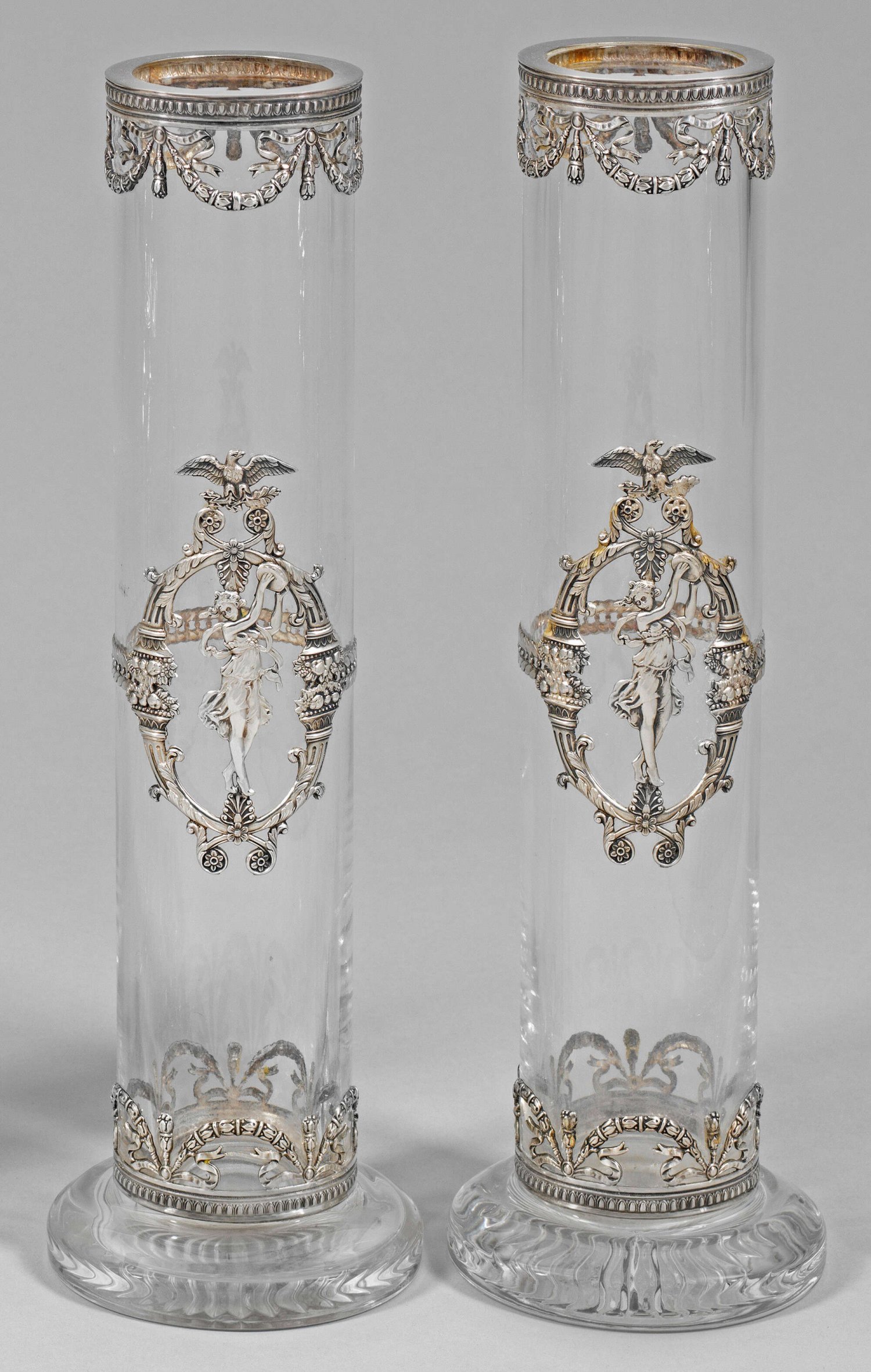 Vasenpaar mit Silbermontierung. Schlanke Zylinderform auf ausgestelltem Sockelfuß. Dreiteilige Montierung, dekoriert mit reliefplastischer Tamborinspielerin, Girlanden und Eierstabfries. Atlantisglas. Gest. 925. H. 38,5 cm.