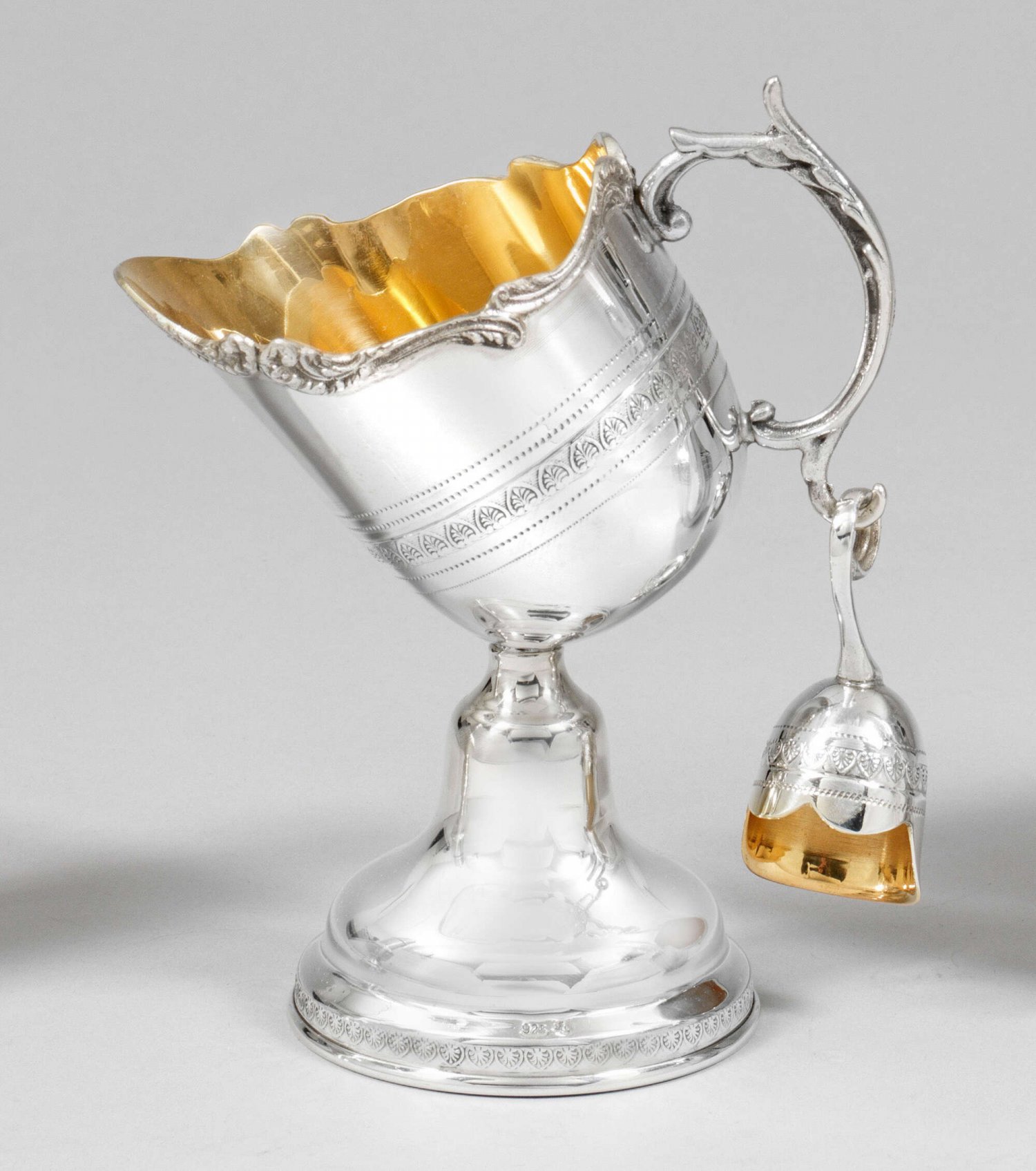 Zuckerschale Silber. Glockenförmiger Stand, übergehend in schräggestellten Korpus mit passig geschweiftem, volutenreliefiertem Rand. Volutenhenkel, daran Zuckerschaufel. Innen vergoldet. Gest. 925. Gew. ca. 215 g. H. 17 cm.