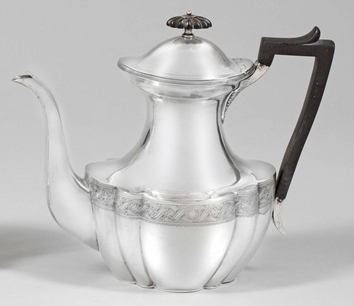 Viktorianische Teekanne Silber. Über ovalem Stand sich passig erweiternder Korpus mit hohem, gekehltem Hals. Unterhalb der Schulter graviertes Wellenband mit Blüten. Tief angesetzte Tülle, gekanteter Bandhenkel aus ebonisiertem Holz. Gest., Beschaumarken, Herstellerzeichen. Gew. ca. 630 g. H. 23 cm.