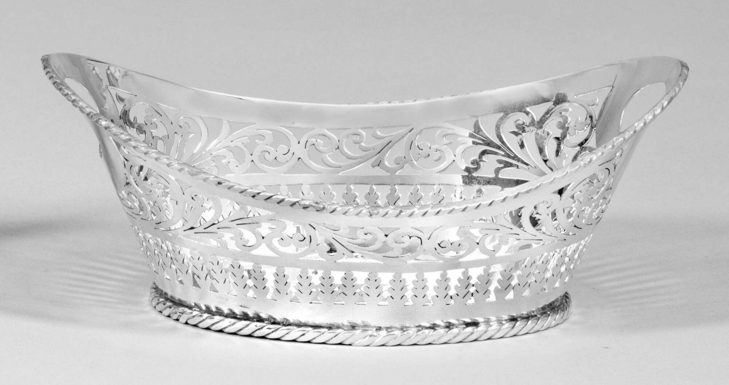Brotkorb Silber. Über flachem Stand sich konisch erweiternde, floral durchbrochen gearbeitete Wandung. Gest. 925. Gew. ca. 300 g. H. 8,5 cm. 22 cm x 13,5 cm.