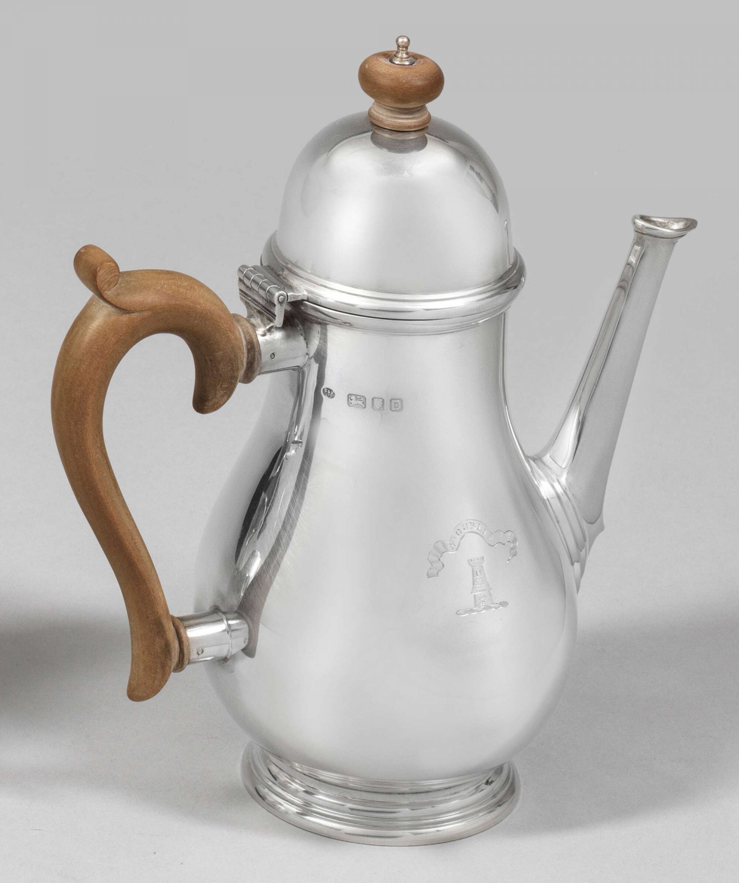 Kaffeekanne Birnenförmig über flachem, profiliertem Stand. Schauseitig graviertes Adelswappen mit Devise. Tief angesetzter Röhrenausguss. Volutenhenkel und Knauf aus Holz. Innen vergoldet. Gest., Beschaumarken, Herstellerzeichen. Gew. ca. 580 g. H. 22 cm.