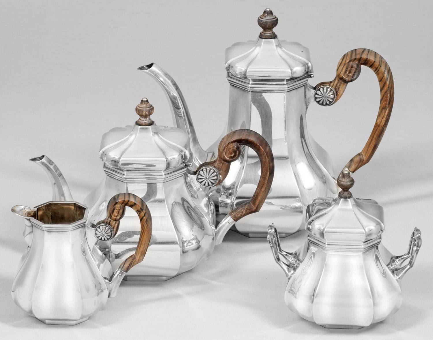 Kaffee- und Teeservice Silber. 4-tlg.; Kaffee- und Teekanne, Sahnegießer und Zuckerdose. Gedrückt bauchiger Korpus mit geschweiften Ecken. Tief angesetzte Tülle, Volutenhenkel aus Holz. Ein Knauf besch.; Gest., Beschaumarken, Jahresbuchstabe g und h, Herstellerzeichen. Gew. zus. ca. 1500 g.