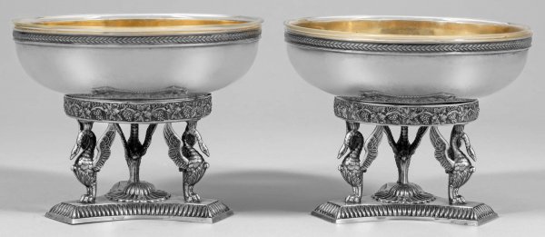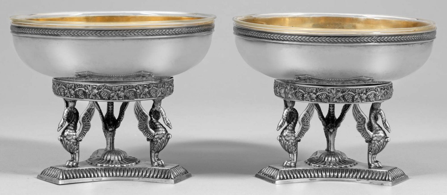 Paar Tafelaufsätze im Empirestil Silber. Dreipassiger, von einem Stabfries gerahmter Stand, zentrale Rosette. Darauf drei vollplastische Schwäne als Träger für einen Haltering mit reliefiertem Weinlaubdekor. Herausnehmbare Schale. Farbloser Glaseinsatz. Innen vergoldet. Gest. 800, Herstellerzeichen, Verkäufermarke Hessenberg, Frankfurt a. M.; Gew. zus. ca. 1210 g. H. 14 cm. D. 19 cm.