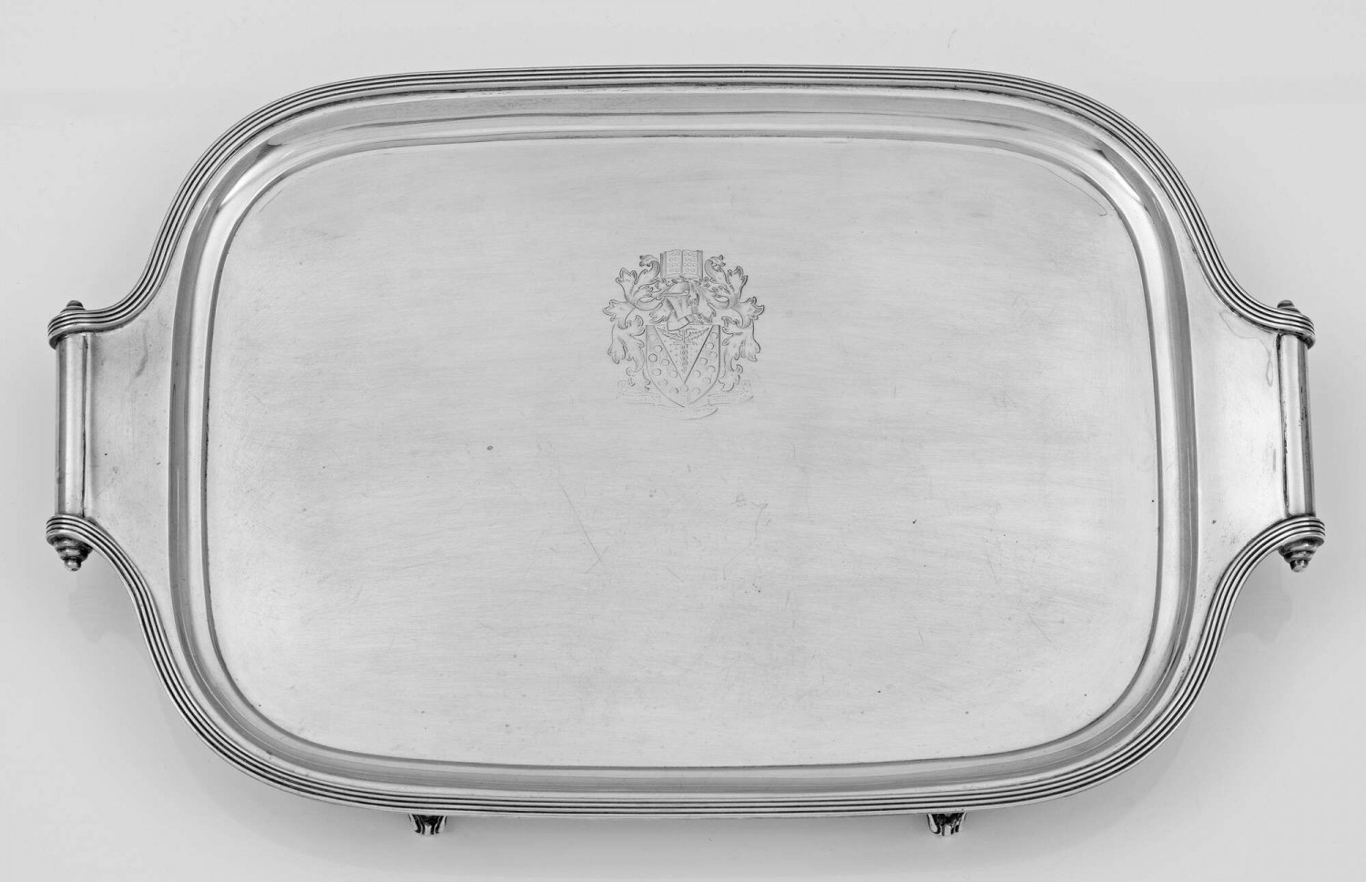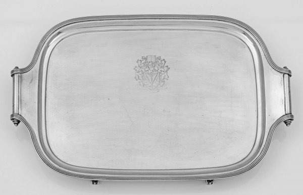 Tablett Silber. Von konischen Füßen getragenes Tablett mit mehrfach profiliertem, an den Schmalseiten in gerundete Griffe übergehenden Rand. Glatter Spiegel zentral graviert mit großem Adelswappen. Minim. Gebrauchsspuren. Gest., Beschaumarke, Herstellerzeichen. Gew. ca. 850 g. 36 cm x 24 cm.