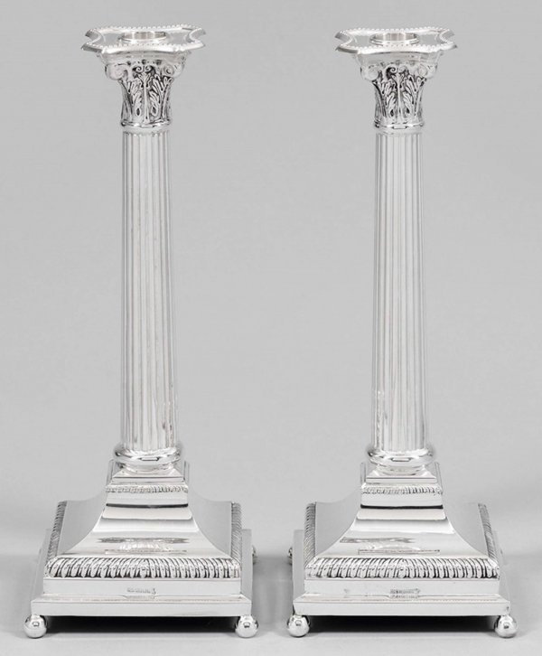 Paar große Tafelleuchter im Empirestil. Silber. Getreppter Stand, beschwert. Hoher, kannelierter Schaft, in reliefierten Akanthuskapitell endend. Gest. 925. H. 31 cm.
