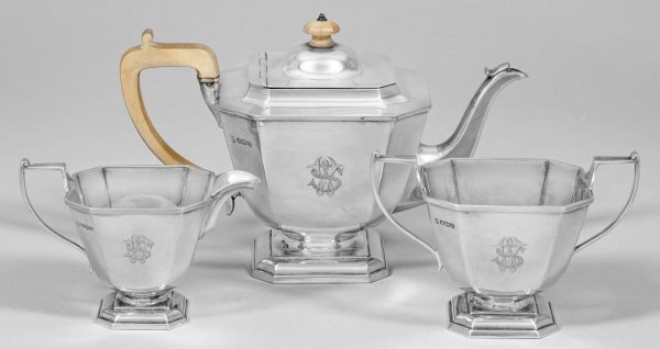 Teeservice Silber. 3-tlg.; Teekanne, Sahnegießer und Kandisschale. Über flachem Stand konischer, facettierter Korpus mit abgesetzter Schulter und flachem Deckel. Seitlich dekoratives, ligiertes Monogramm. Tief angesetzte Tülle, Volutenhenkel aus Holz. Gest., Beschaumarken, Herstellerzeichen. Gew. zus. ca. 1250 g.
