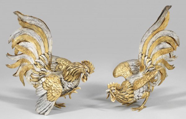 Paar Skulpturen "Kampfhähne" als Tafeldekoration Silber, teilw. vergoldet. Gegenstücke. Äußerst naturalistisch und detailreich ausgeführte Darstellung zweier Hähne im Kampf mit fein graviertem, prächtigem Federkleid. Gest. 925. Gew. zus. ca. 1350 g. H. 25 cm - 27 cm.