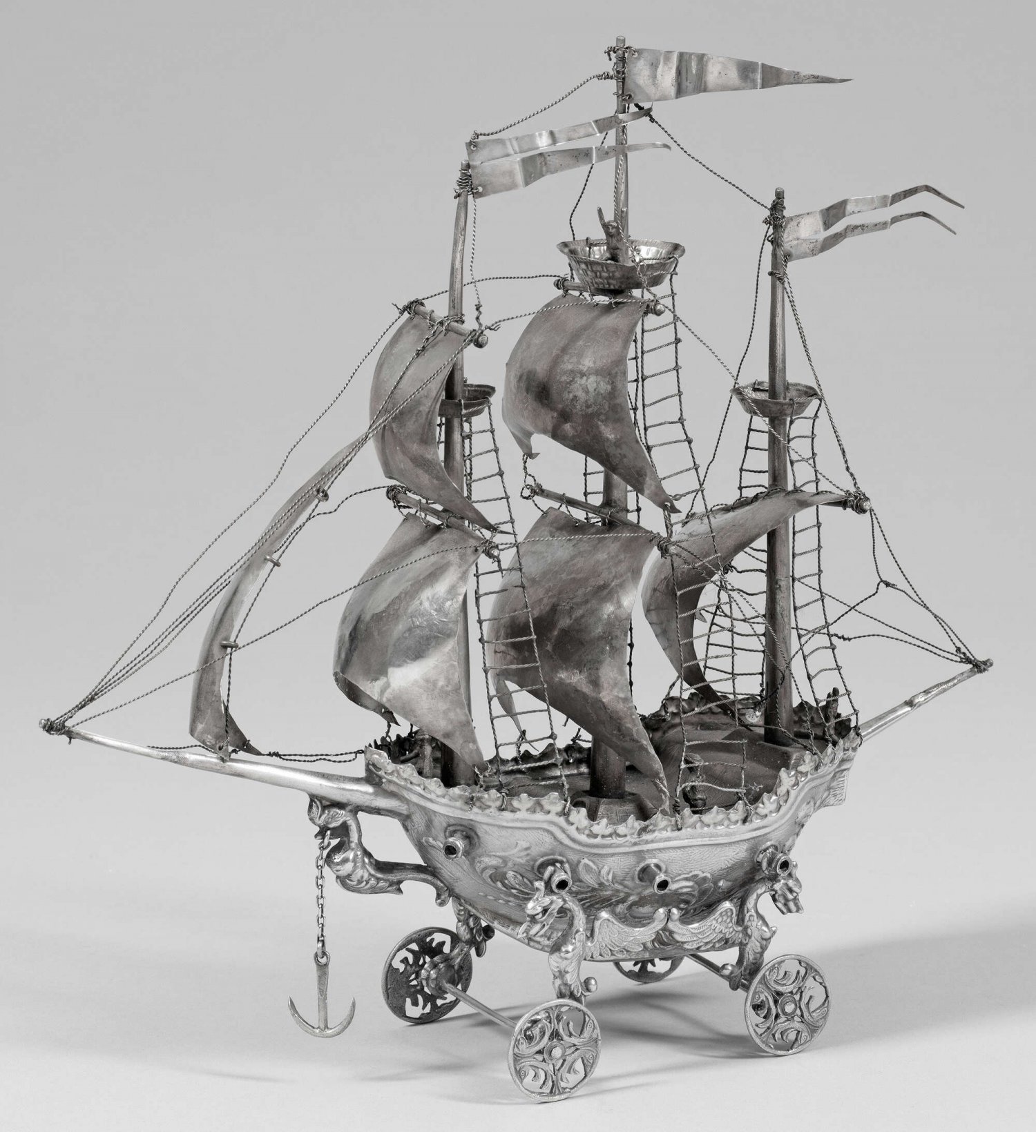 Prächtiger Dreimaster als Tafeldekoration Silber. Über vier Rädern tragen geflügelte Fischfabelwesen das mit gehissten Segeln und gelichtetem Anker segelnde Schiff. Am Rumpf, dessen Außenseite mit Blattgirlanden überzogen ist, acht Kanonen. Takelage aus fein ziselierten Drähten, die Segel im Hammerschlagdekor. An Deck und im oberen Aussichtskorb fünf kleine Matrosen mit erhobenen Armen. Minim. rest. und besch.; Gest.; Pseudomarken. Gew. ca. 575 g. H. 34 cm.