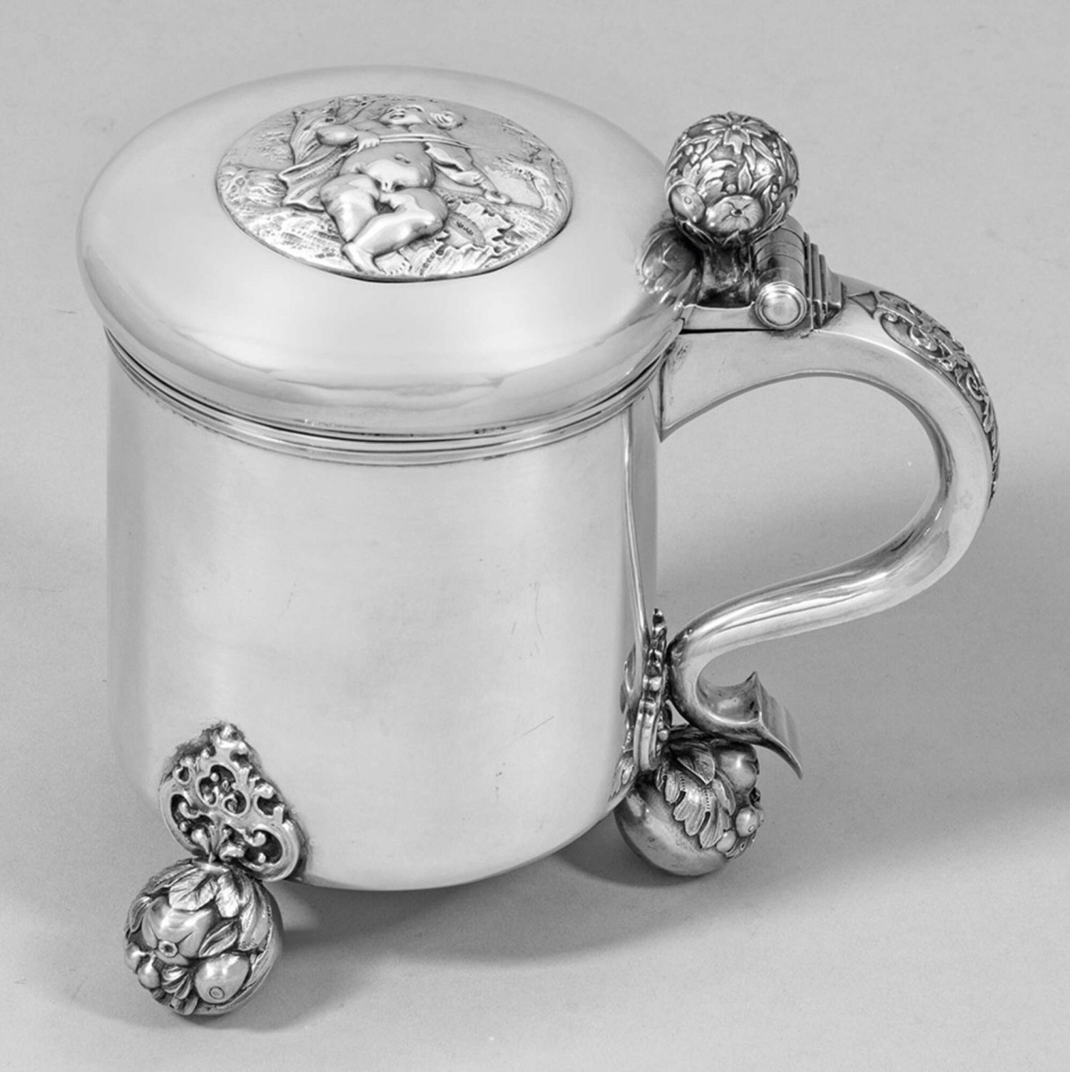 Deckelhumpen im Barockstil Silber. Zylindrischer, glatter Korpus, getragen von ausgestellten Kugelfüßen mit Fruchtrelief. Auf gewölbtem Deckel reliefierte Darstellung einer musizierenden Amorette. Breiter Bandhenkel reliefiert in Form einer Weinranke, kugeliger Drücker. Innen vergoldet. Gest., Stadtmarke, Jahresbuchstabe Y5, Meister Christian Hammer (wird Meister 1845). Gew. ca. 560 g. H. 16 cm.