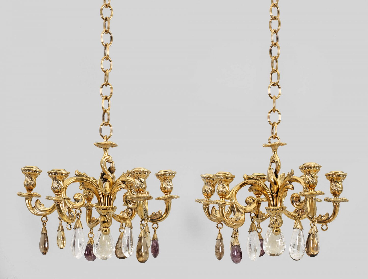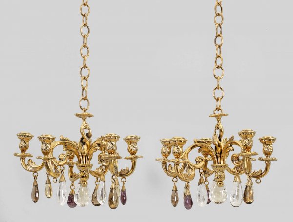Paar seltene Deckenleuchter Silber, voll vergoldet. 6-flg.; Kurzer Schaft. Davon ausgehend drei paarweise ausschwingende Leuchterarme aus reliefierten Voluten mit Akanthusblattauflage. Hohe vasenförmige Tüllen über geschweiften Traufschalen mit reliefplastischem Rocailledekor. Behang aus großem, tropfenförmigem, poliertem Bergkristall, Rauchquarz und Amethyst. Als Aufhängung lange Gliederkette. Gest. 13 Lot, Stadtmarke. H. 28 cm. D. 38 cm.