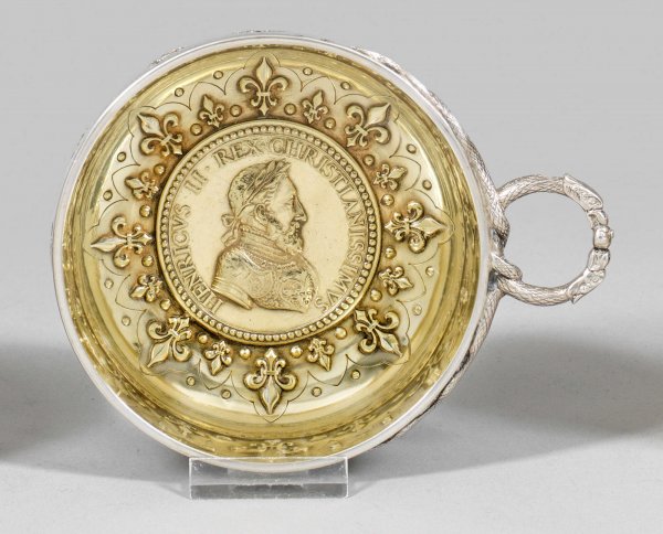 Qualitätvolle Historismus-Weinprobierschale Silber. Im tief gemuldeten Spiegel reliefplastisches Porträt von Kaiser Heinrich II., umzogen von stilisierten Lilien. Wandung unterteilt durch reliefplastische Weinreben sowie unterschiedliche Gerätschaften. Ringgriff. Innen vergoldet. Gest., Pseudomarken. Gew. ca. 330 g. H. 4 cm. D. 11,5 cm.