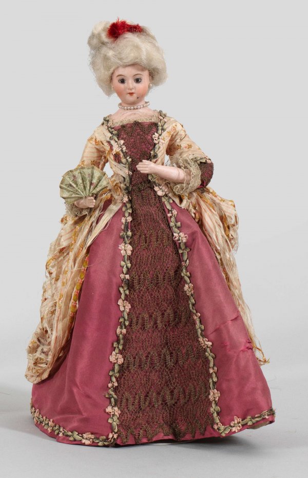 Modepuppe in Rokoko-Kostüm Biskuitporzellan-Kurbelvollkopf mit durchstochenen Ohren, geschlossenem Mund, fest eingesetzten Augen auf schlankem Gliederkörper mit Porzellanunterarmen und -beinen. Aufwändig bekleidet. Gem. 4/1 - 3/0. Bespielt. H. 29 cm.