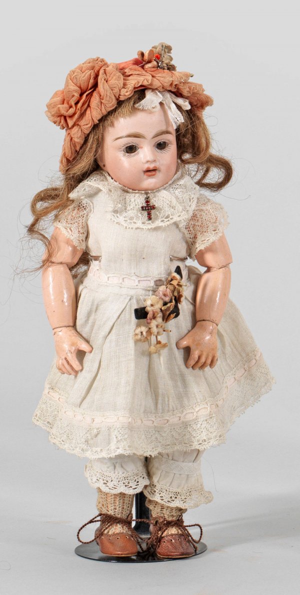 Seltenes kleines "Bébé" von Léon Casimir Bru Biskuitporzellan-Kurbelkopf mit durchstochenen Ohren, geöffnetem Mund, fest eingesetzten braunen Augen und hellbrauner Echthaarperücke auf Gliederkörper aus Holz und Masse. Bekleidet. Schuhe bez. Déposé. Im Nacken gem. BRU Jne R 2. Bespielt. Haarriss am Hinterkopf. Körper teilw. farblich überarbeitet. H. 28 cm.