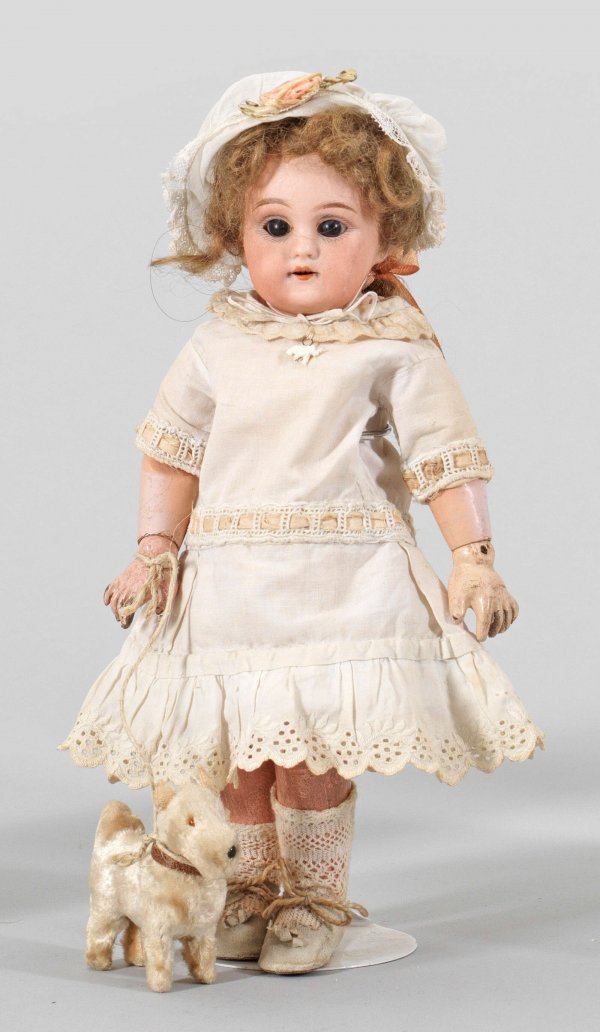 A small porcelain head Bébé by Lehmann & Cie. with a small dog.