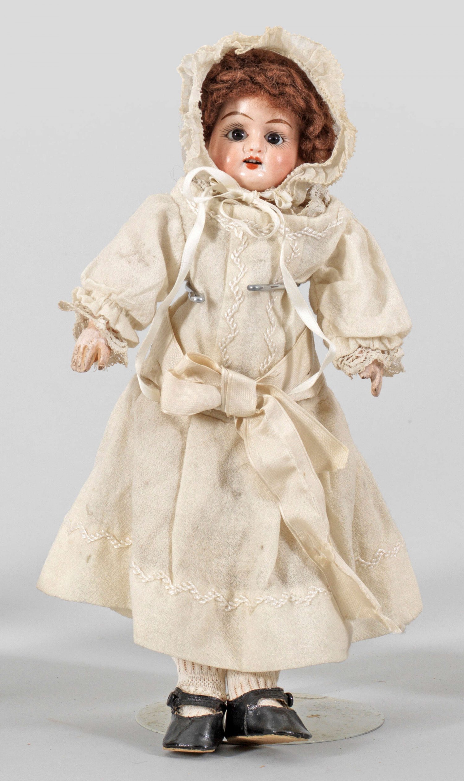 Kleines französisches "Bébé" Biskuitporzellan-Kurbelkopf mit geöffnetem Mund, fest eingesetzten braunen Augen und fest aufgeklebter dunkelbrauner Mohairperücke auf einfachem Gliederkörper aus Masse mit geraden Beinen. Bekleidet. Im Nacken gemarkt: DP Paris 3. Bespielt. H. 31 cm.