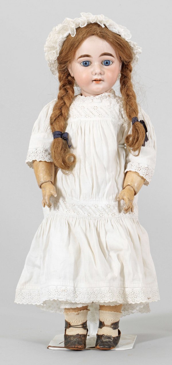 Große Gliederpuppe von Armand Marseille Feiner Biskuitporzellan-Kurbelkopf mit geöffnetem Mund, blauen, fest eingesetzten Augen sowie langer hellbrauner Echthaarperücke auf Gliederkörper aus Masse. Im Nacken gem. AM 12 DEP made in Germany. Bekleidet mit alten Lederschuhen. Bespielt. Feiner Haarriss am Hinterkopf. Chip am Ohr. H. 63 cm.