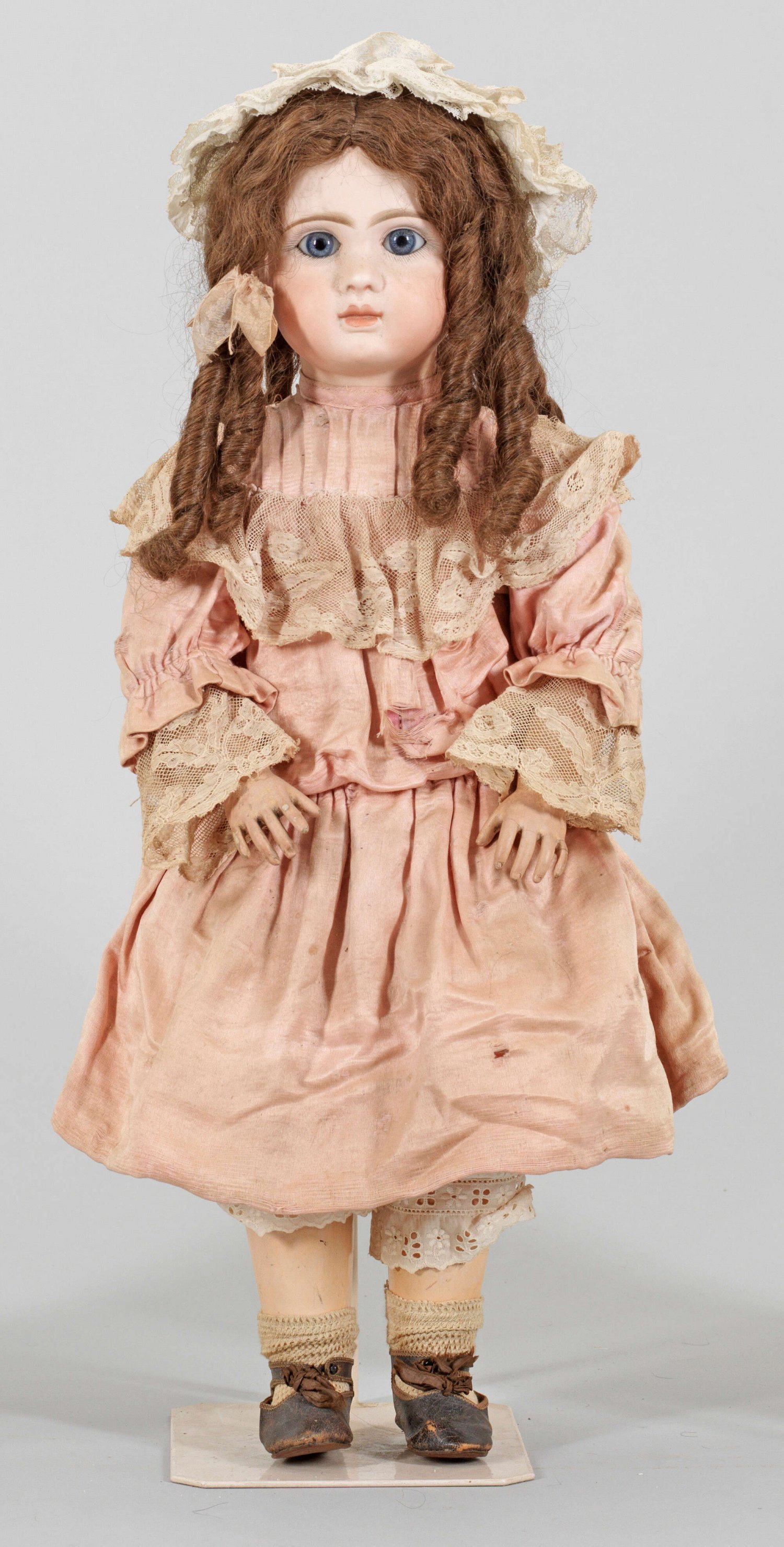 Großes seltenes "Bébé Le Parisien" von Jules Nicolas Steiner Biskuitporzellan-Kurbelkopf mit geschlossenem Mund, durchstochenen Ohren mit Ohrringen, fest eingesetzten, blauen, sog. Paperweight-Glasaugen sowie langer brauner Echthaarperücke mit Korkdeckel auf Gliederkörper mit schlanken Fingern und abstehendem Zeh aus Masse. Aufwändig alt bekleidet mit Lederschuhen, bez. 10 Paris Marque Déposé mit Heißluftballon. Am Hinterkopf gem. A. 17 Paris sowie roter Stempel Le Parisien Bte S.G.D.G. Bespielt. Winziger Chip am Ohrloch. Minim. Haarriss an der Stirn. H. 31 cm.