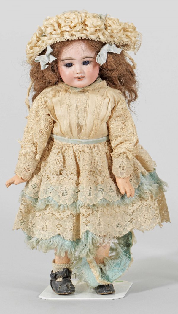 Kleines "Eden Bébé" von Fleischmann & Bloedel Biskuitporzellan-Kurbelkopf mit durchstochenen Ohren, geöffnetem Mund und fest eingesetzten blauen Glasaugen sowie brauner Echthaarperücke mit Korkdeckel auf Gliederkörper aus Holz und Masse. Alt bekleidet. Am Hinterkopf gem. EDEN BEBE PARIS 5 DEPOSE. Bespielt. Körper und wohl Kopf teilw. farblich überarbeitet. H. 38 cm.