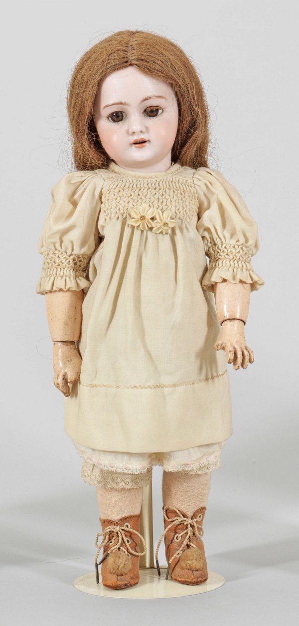 Gliederpuppe "Bébé Jumeau" sog. DEP-Jumeau. Biskuitporzellan-Kurbelkopf mit durchstochenen Ohrlöchern, geöffnetem Mund, braunen Schlafaugen sowie langer, fest aufgeklebter Echthaarperücke auf Gliederkörper aus Holz und Masse. Im Nacken gem. DEP 6 sowie Körper mit Etikett BÉBÉ JUMEAU Deplome d'Honneur. Alt bekleidet sowie Lederschuhe. Bespielt. Winziger Chip am Ohrloch. Augenlider mit Abplatzern. H. 40 cm.