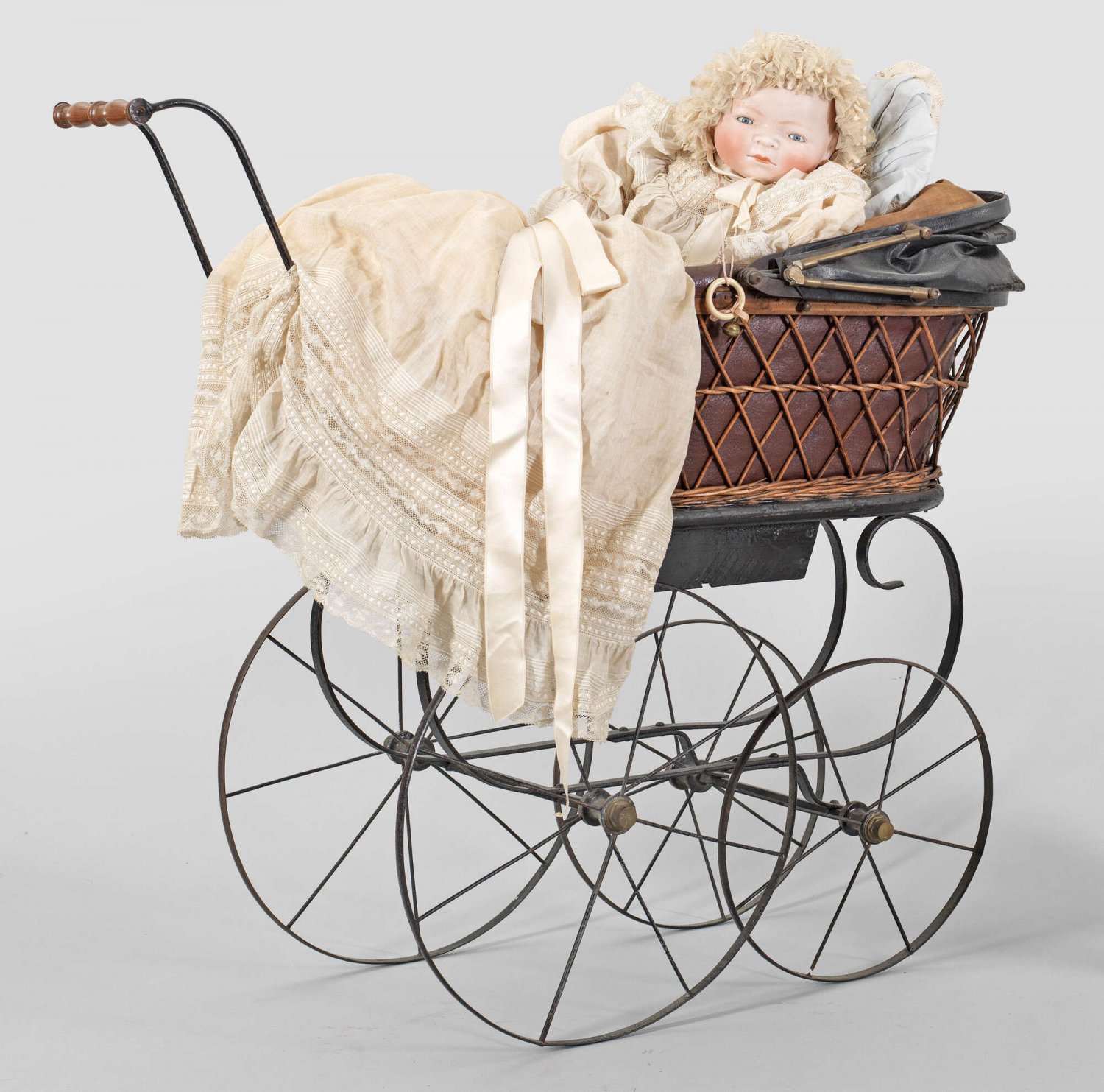 Großes "Bye-Lo-Baby" von Grace Storey Putnam mit Puppenwagen Biskuitporzellan-Vollkopf mit Ringhals, geschlossenem Mund und blauen Schlafaugen auf Stoffkörper mit Celluloid-Händen von Schildkröt. Aufwändig bekleidet. Im Nacken gem.: Copyr. by Grace S. Putnam Made in Germany 1373/50. Dazu Puppenwagen aus Metall, Holz und Korbgeflecht. Puppen-L. 45 cm.