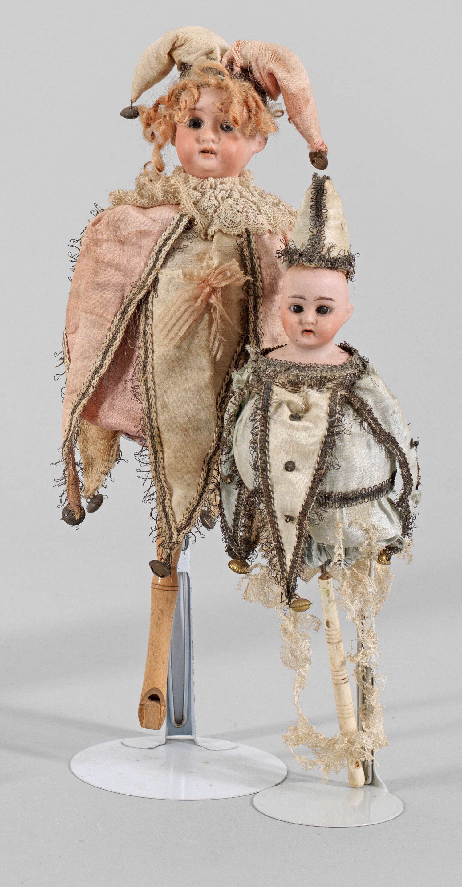 Zwei seltene Handpuppen sog. Marotte. Biskuitporzellan-Brustkopf mit geöffnetem Mund, blauen bzw. brauen, fest eingesetzten Augen sowie teilw. aufgeklebten Mohair-Haaren. Griff aus Bein bzw. Holz. Harlekin-Kostüm. Im Nacken gem. Germany. Bespielt. Spielwerk teilw. defekt. H. 32-36 cm.