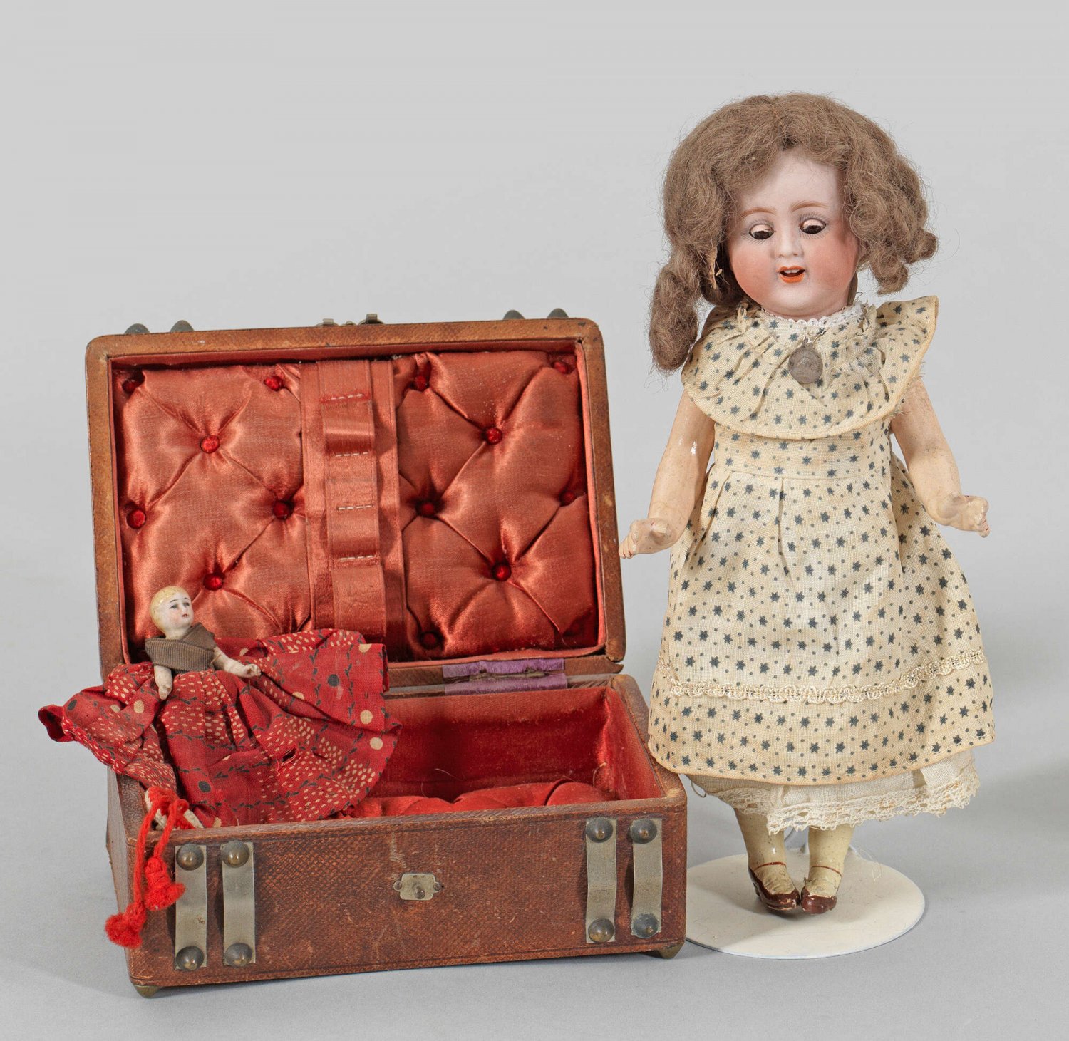 Lot 2243: Kleine Gliederpuppe und Miniaturpuppe im Koffer