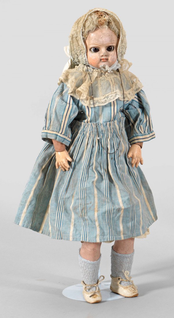 Gliederpuppe Schräggestellter, bemalter Masse-Brustkopf mit geschlossenem Mund, braunen Schlafaugen und hellgelockter Fellperücke auf Gliederkörper aus Stoff, Holz und Masse. Alt bekleidet. Brustblatt bez. Waschecht. Bespielt mit Altersspuren. Hände abweichend. H. 45 cm.