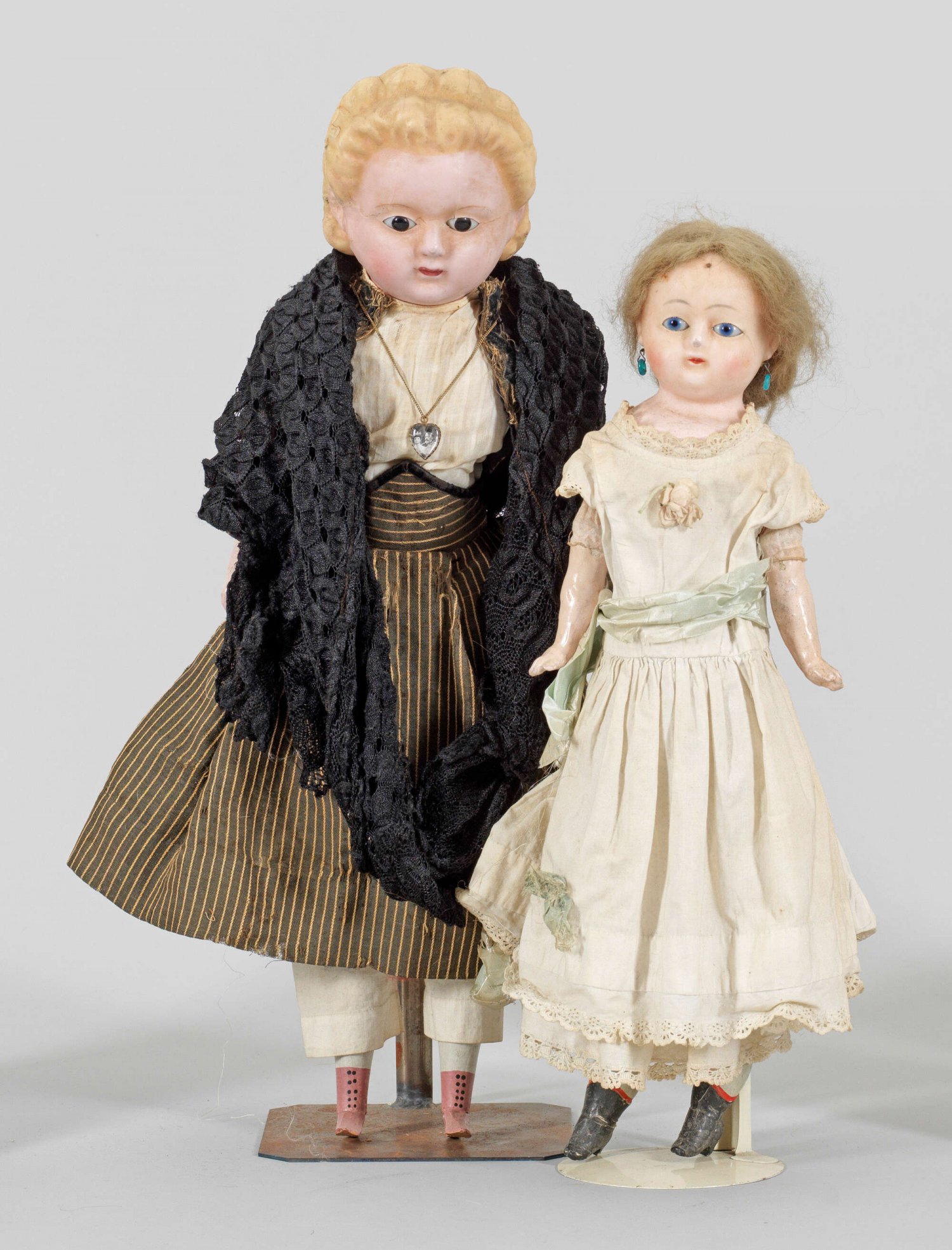 Zwei Wachspuppen Wachsüberzogener Brustkopf aus Masse mit geschlossenem Mund, fest eingesetzten blauen Augen, teilw. mit Ohrringen und dunkelblonden Haaren auf Gliederkörper aus Stoff und Masse. Bespielt. Teilw. altersbedingte Risse. 1 Auge besch.; H. 47 - 56,5 cm.