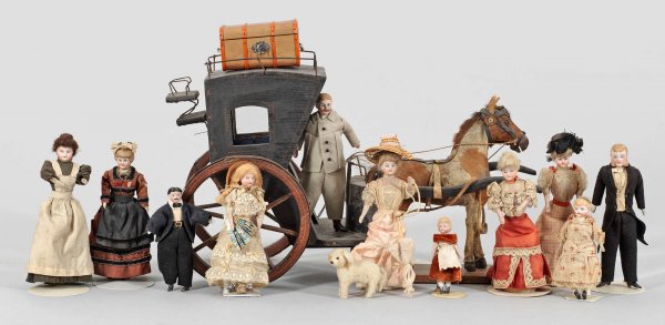 Seltene Puppenstuben-Gesellschaft mit Puppenkutsche Einspännige sog. Hansom-Cab mit erhöhtem Fahrersitz und Speichenrädern aus Holz sowie fellbezogenes, naturalistisch gestaltetes Zugpferd mit Glasaugen und Lederzaumzeug. Elf Puppenstubenpuppen mit Biskuitporzellan-Brustköpfen und teilw. modellierten Haaren auf Gliederkörpern mit Biskuitporzellanarmen und -beinen unterschiedlicher Größe mit fest angenähter Bekleidung, unterschiedliche großbürgerliche Akteure, Dienstboten und Kinder darstellend. Dazu fellbezogener Hund sowie kleiner Reisekoffer. Bespielt. Teilw. besch.; Kleidung partiell zerschlissen. Kutschen-H. 28,5 cm. 46 cm x 20 cm. Puppen-H. 6,5 cm - 18,5 cm.