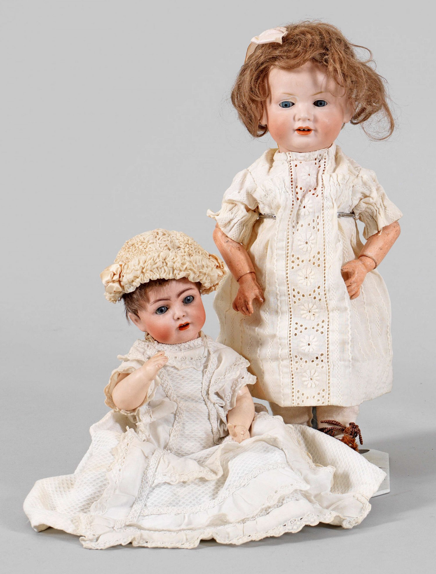 A German porcelain head character doll by Franz Schmidt & Co. In addition a doll by Baehr & Proeschild with restored chip to one eye.
