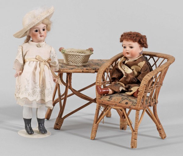 Zwei kleine Gliederpuppen mit Gartenmöbeln Biskuitporzellan-Kurbelkopf mit fest eingesetzten Augen auf Biskuitporzellan-Gliederkörper. Im Nacken gem. Petite Francaise J (Anker) V France OM; Kurbelkopf mit braunen Schlafaugen auf Massekörper. Im Nacken gem. K (Stern) R Simon & Halbig. Dazu Puppen-Korbsessel und entsprechender Tisch. Bespielt. Puppen-H. 21-26 cm.