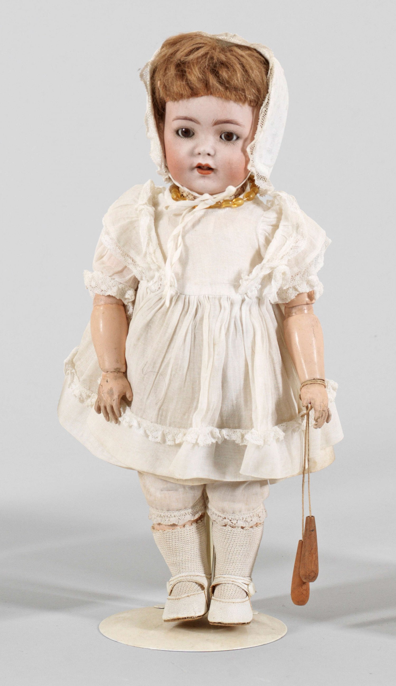 Kleine Charakterpuppe von Franz Schmidt & Co. Biskuitporzellan-Kurbelkopf mit durchstochenen Nasenlöchern, geöffnetem Mund, braunen Schlafaugen sowie kurzer hellbrauner fest aufgeklebter Mohairperücke auf sog. Toddlerkörper aus Holz und Masse. Im Nacken gem. 1295 F.S. & Co. 30. Bekleidet. Bespielt. Abplatzer an den Augenlidern. Finger teilw. rest.; H. 34 cm.