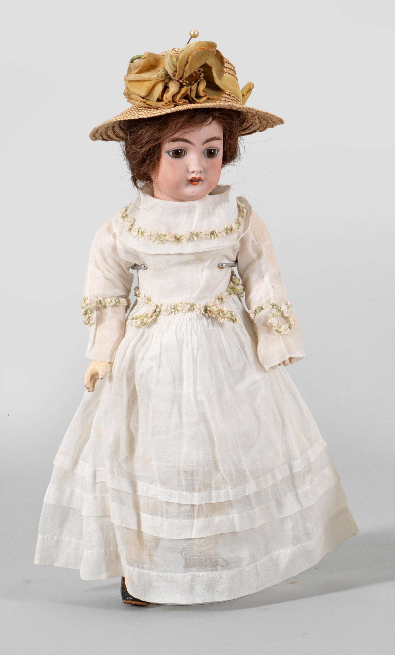 Gliederpuppe mit Musikwerk Biskuitporzellan-Kurbelkopf mit durchstochenen Ohren, geöffnetem Mund, braunen Schlafaugen und brauner Echthaarperücke auf Gliederkörper mit feststehenden Handgelenken aus Masse mit eingebautem Musikwerk. Schlüsselaufzug am Rücken. Auslösung über Faden. Bekleidet. Im Nacken gem. 189-8 Germany. Bespielt. Körper teilw. überstrichen. Musikwerk schwergängig. H. 53 cm.