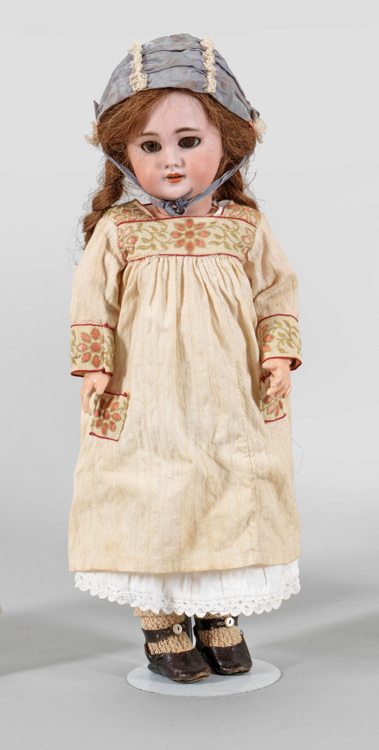 Gliederpuppe Biskuitporzellan-Kurbelkopf mit durchstochenen Ohren, geöffnetem Mund, braunen Schlafaugen und Echthaarperücke auf Gliederkörper aus Holz und Masse. Bekleidet. Alte Lederschuhe bez. c.P.; Im Nacken gem. DEP 7. Bespielt. Finger teilw. rep.; H. 46 cm.