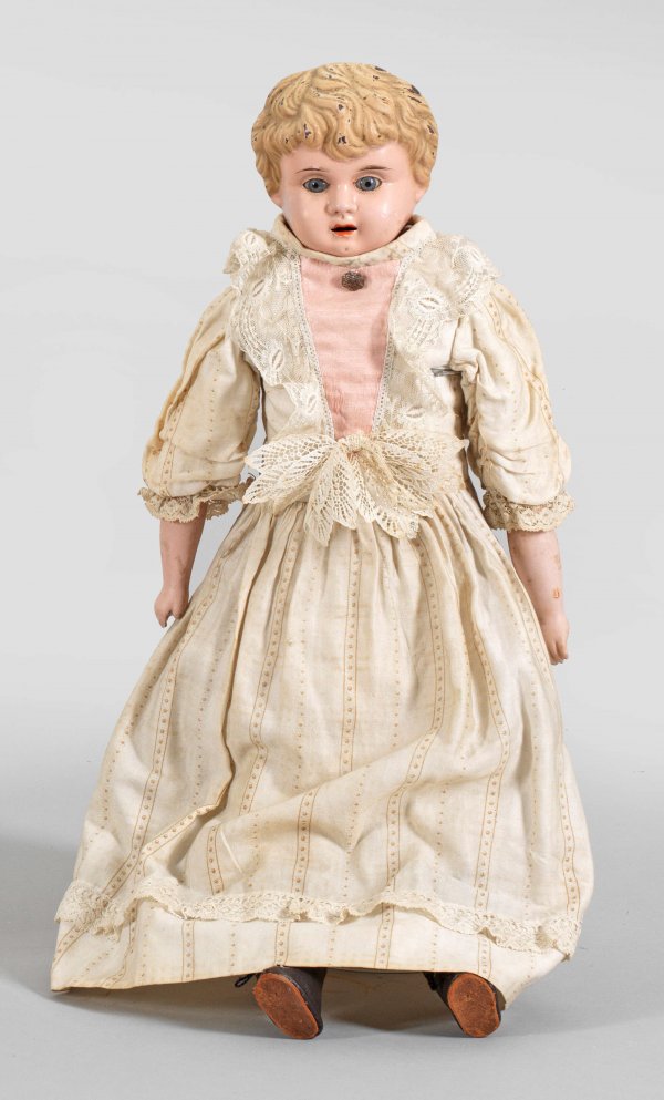 Metallkopfpuppe von Minerva Farbig lackierter Metall-Brustkopf mit geöffnetem Mund, fest eingesetzten blauen Augen und modellierten blonden Haaren auf Gliederkörper aus Wachstuch und Stoff mit Porzellan-Unterarmen. Bekleidet. Bespielt. H. 53 cm.