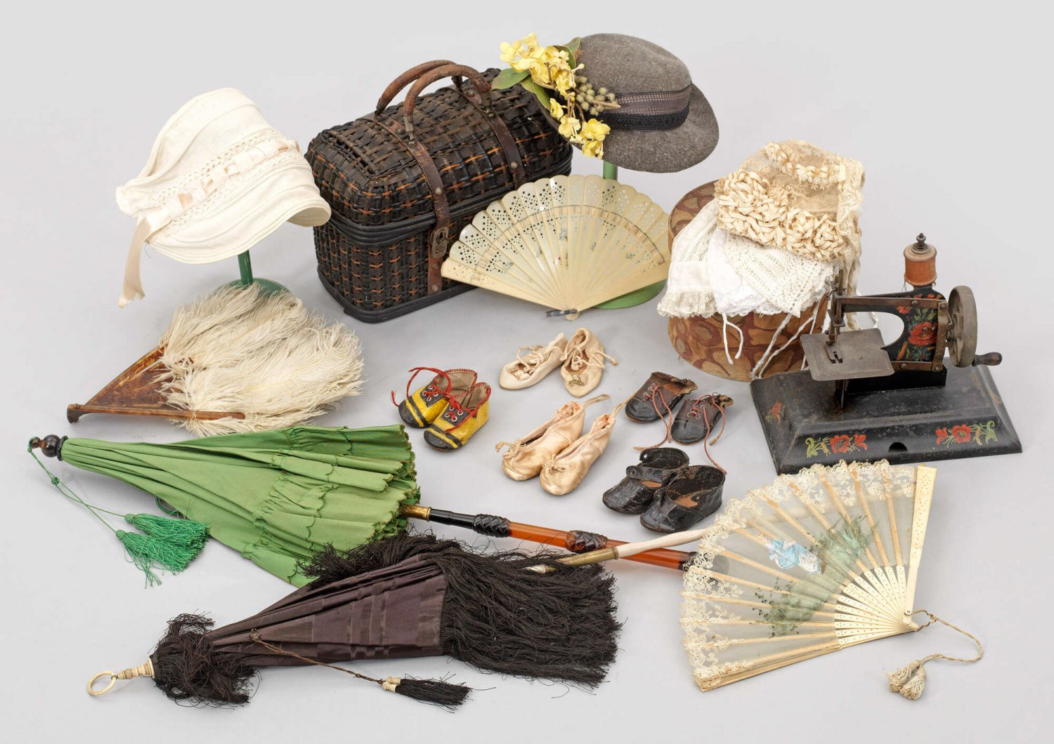 Konvolut Kinder-Modeartikel und Puppenzubehör Zwei Kinder-Sonnenschirme, ein Paar Kinderhandschuhe, Korb, drei Fächer, fünf Paar Puppenschuhe. Fünf, teilw. sehr fein gearbeitete Spitzenhauben und Filzhut sowie Kinder-Nähmaschine. Schuhe-L. 6,8-8,5 cm.