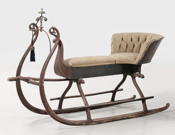 Kinderschlitten Holz, dunkelbraun gefasst sowie rot und beigefarben abgesetzt. Offen gestalteter Korpus auf schmalen, teilw. volutenförmig eingerollten Streben und entsprechenden Stegen. Schmale Sitzfläche mit gewölbter Rückenlehnenrahmung, gepolstert und bezogen. Figural gestaltete Halterung mit Glocke und Schellen. H. 94 cm. 142 cm x 57 cm.