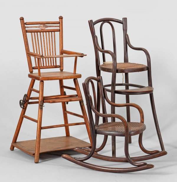 Drei Puppenstühle Zwei Hochstühle und ein Schaukelstuhl. Buchenholz, teilw. dunkel gebeizt. Gestell aus gebogten Rundstäben mit gerundeter Zarge in der Art der berühmten Thonet-Stühle. Sitzfläche aus Rohrgeflecht; klappbares Gestell aus schräggestellten Rundstäben. Unbez.; H. 38 - 64 cm.