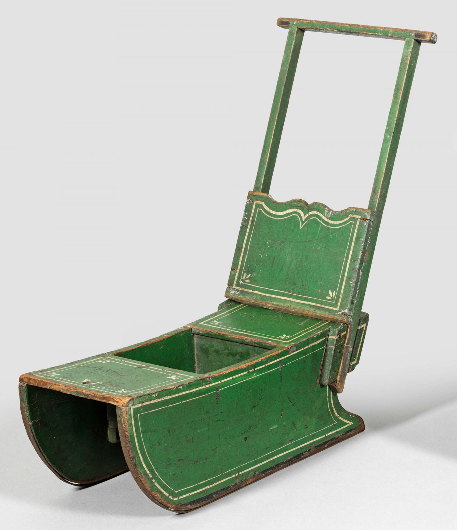 Kleiner Kinderschlitten Holz, grün bemalt. Rechteckiger, zweisitziger Korpus mit Aussparung für Füße, in flache Kufen übergehend. Abnehmbare Rückenlehne mit schräggestelltem Griff. Monogramm J.K.; H. 90 cm. 96 cm x 43 cm.