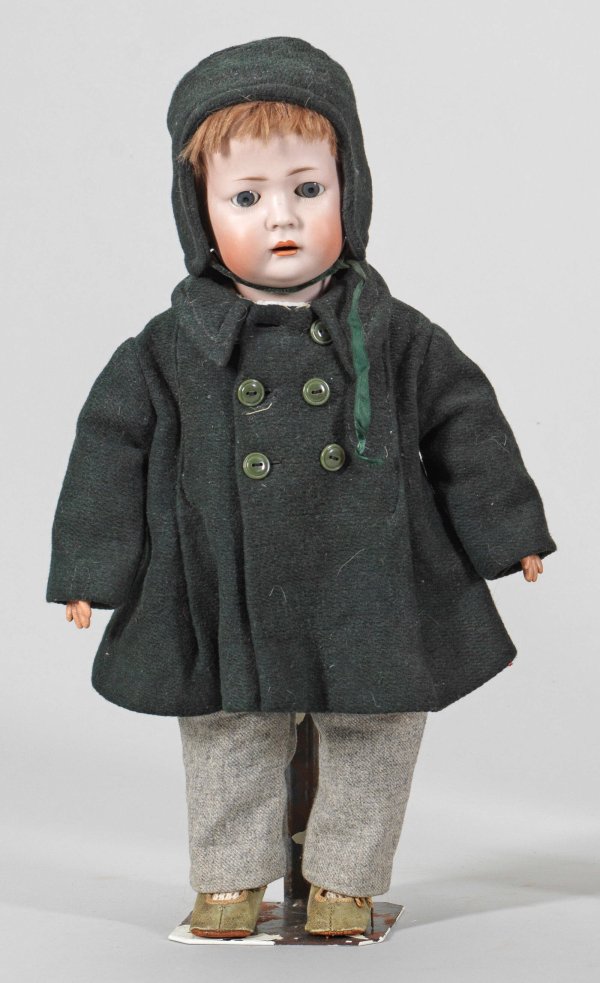 Charakterjunge von Koenig & Wernicke Biskuitporzellan-Kurbelkopf mit geöffnetem Mund, blauen Schlafaugen sowie dunkelblonder Mohairperücke auf sog. Toddlerkörper aus Holz und Masse. Älter bekleidet. Am Hinterkopf gem. K&W 1070 V 10. Bespielt. H. 48 cm.