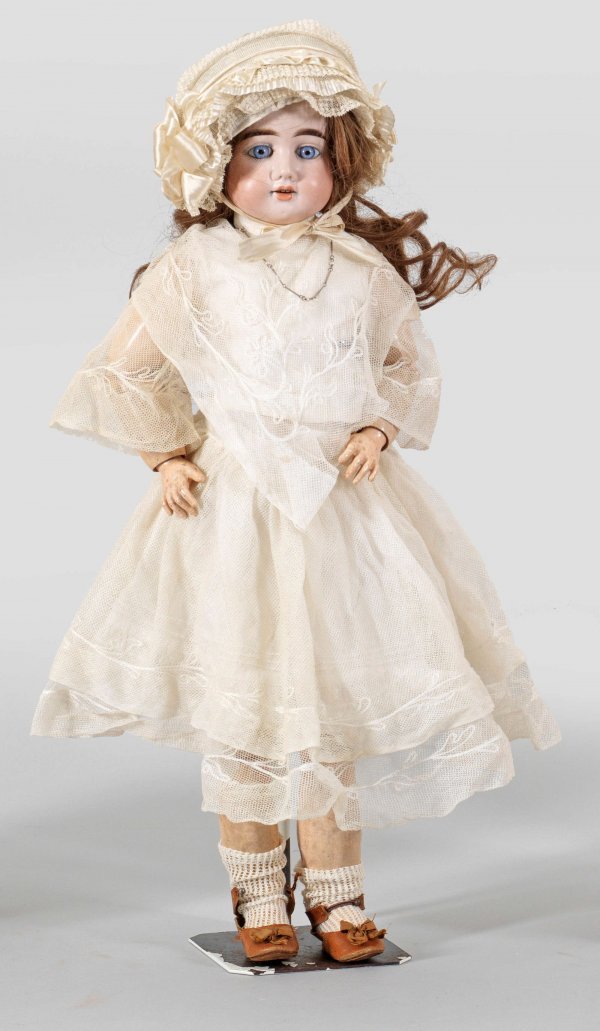 Große Gliederpuppe Biskuitporzellan-Kurbelkopf mit geöffnetem Mund, fest eingesetzten blauen Augen und langer,hellbrauner Echthaarperücke auf Gliederkörper aus Holz und Masse. Bekleidet sowie alte Lederschuhe, bez. L.I.; Im Nacken gem. 1000 3. Bespielt. H. 58 cm.