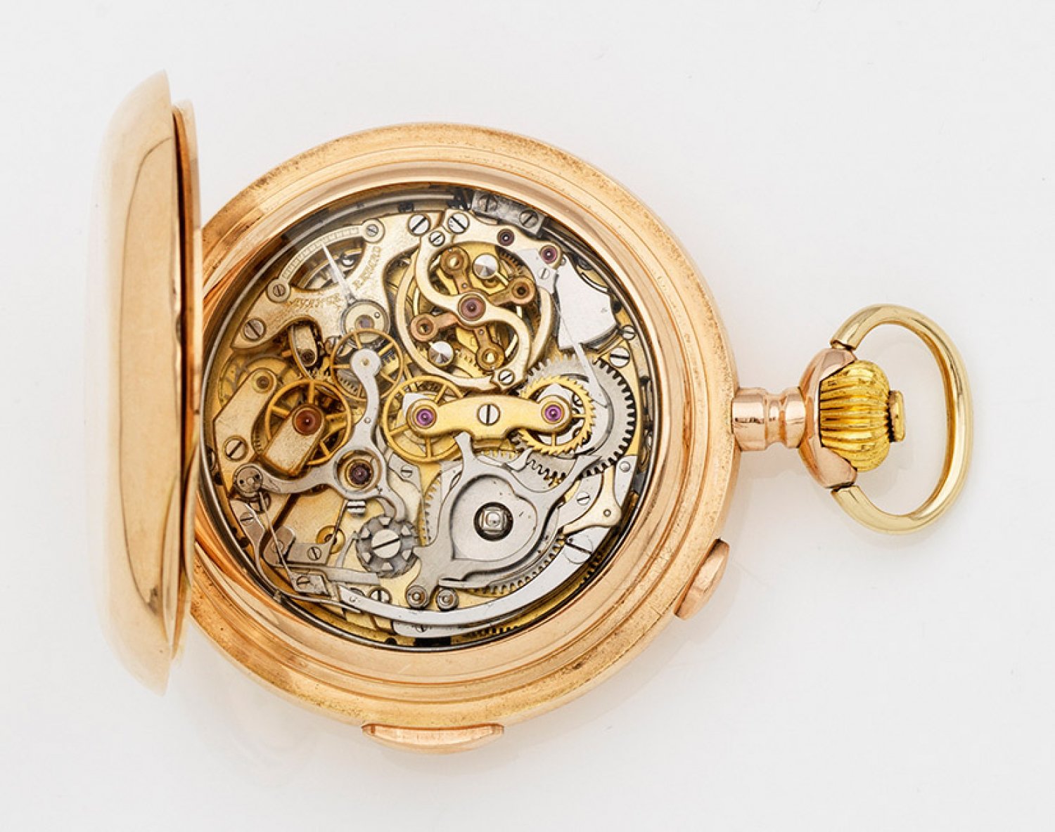 A gentlemen's pocket watch, mechanical movement with quarter repetition and chronograph, in 14 k gold.