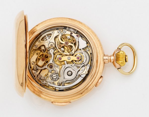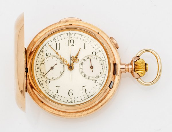 Savonette-Taschenuhr Um 1896. Gelbgold, gest. 585. Flaches Dreideckel-Goldgehäuse, ecrufarbenes Emailzifferblatt mit Minuterie, schwarzen arabischen Zahlen und Breguet-Zeigern, kleiner Sekunde und Chronograph aus der Mitte. Mechanisches Werk mit Handaufzug, Viertelstunden-Repetition. Gehäuse-Nr. 88995. D. 5,5 cm. Gew. ca. 134,26 g.