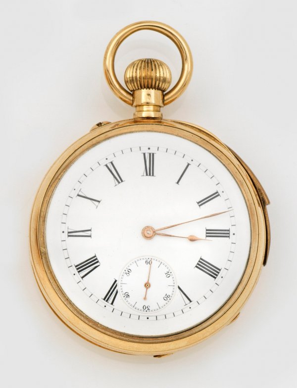 Taschenuhr mit Repetition Um 1900. Rosegold, gest. 18 ct.; Glattes, 2-Deckel-Uhrengehäuse mit Besitzer-Monogramm, weißes Emailzifferblatt mit schwarzen römischen Zahlen, Dauphin-Zeiger und kleiner Sekunde. Mechanisches Werk mit Handaufzug, Repetition. Gehäuse-Nr. 6660. Gew. ca. 90,25 g.