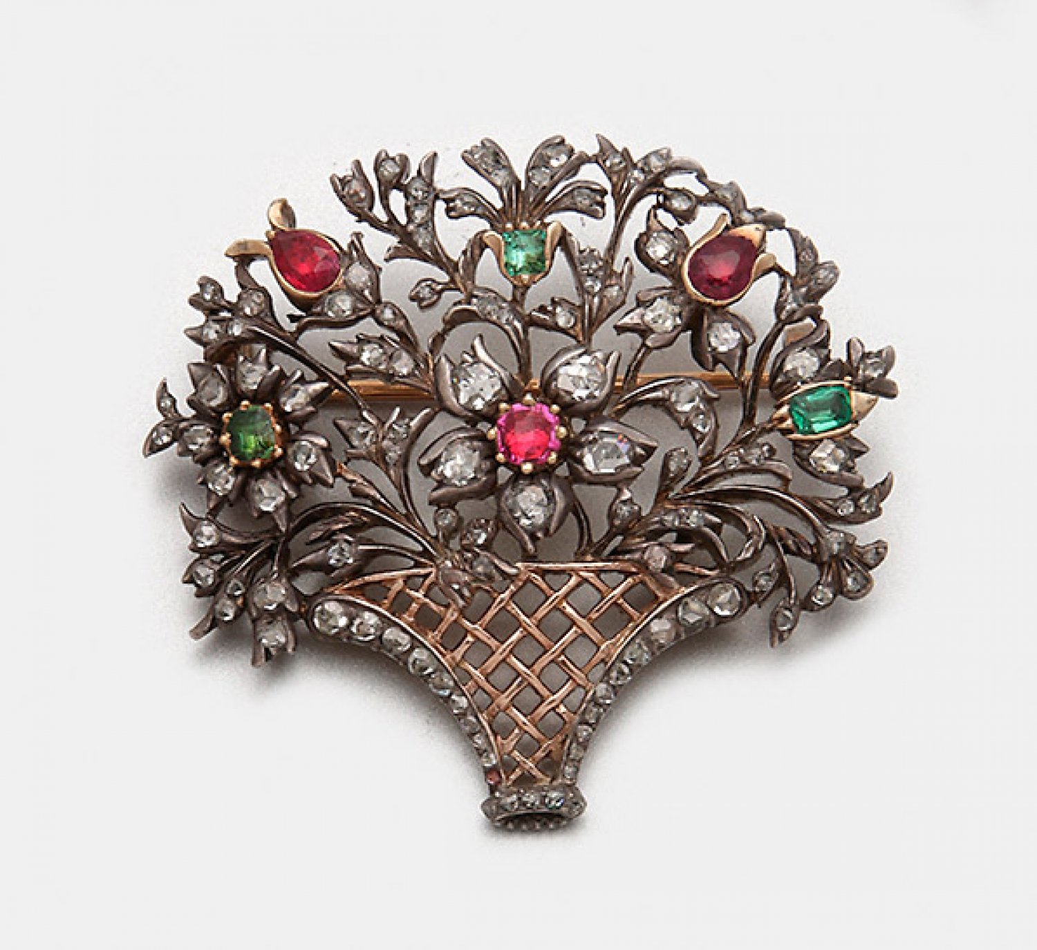 Louis Seize-Diamantbrosche Frankreich. Ende 18. Jh.; Gelbgold und Silber, 14 ct.; Dekorativ gestaltet in Form eines Blütenkorbes in Ajour. Schauseitig besetzt mit Diamantrosen, grünen Granaten und Rubinen. Gew. ca. 13,52 g.