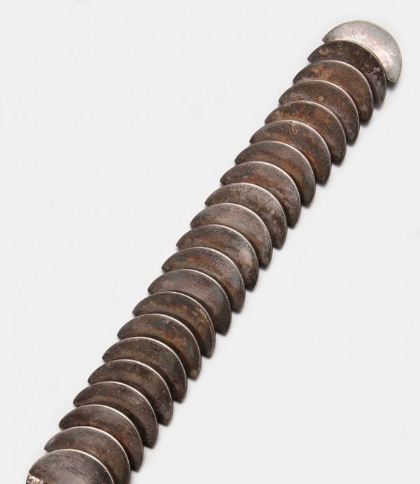Armband-"Disk" von Astrid Fog für Georg Jensen Kopenhagen, Dänemark. 1969. Sterling Silber, gest. 925. Breite Bandform aus halbmondförmigen Gliedern in schuppenartiger Anordnung. Herstellerzeichen, Gest. 169. Gew. ca. 131,15 g.