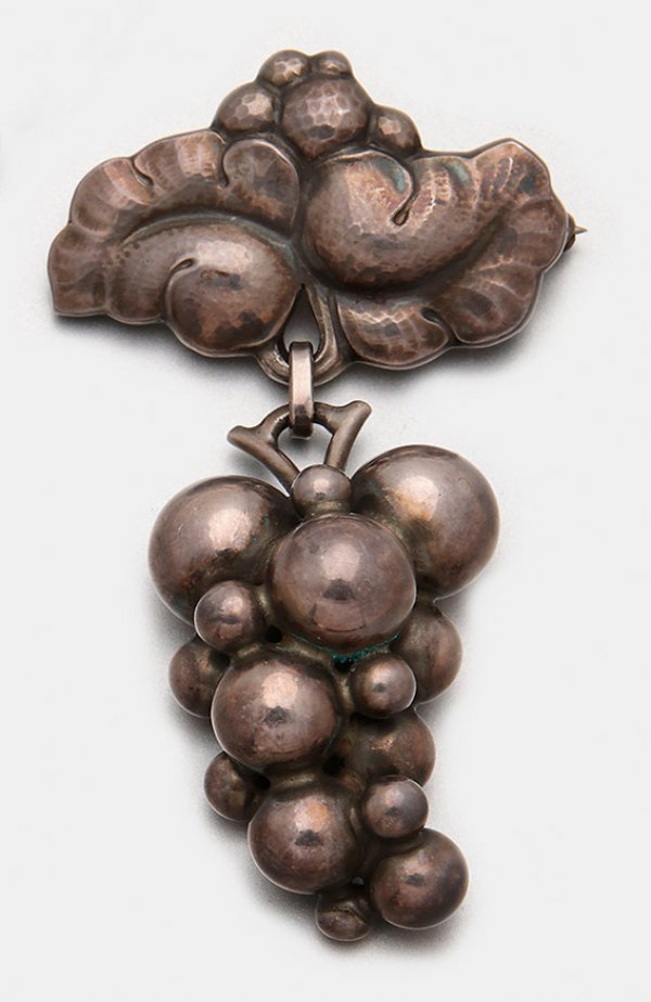 Brosche-"Moonlight Grapes" von H. Nielsen für Georg Jensen Dänemark, nach 1945. Silber, gest. 925. Vollplastisch gearbeitete Brosche in Form einer Weinrebe mit Blattwerk. Herstellerzeichen. Sehr feine Silberschmiedeausführung nach einem Entwurf von Harald Nielsen aus den 1920er Jahren.
