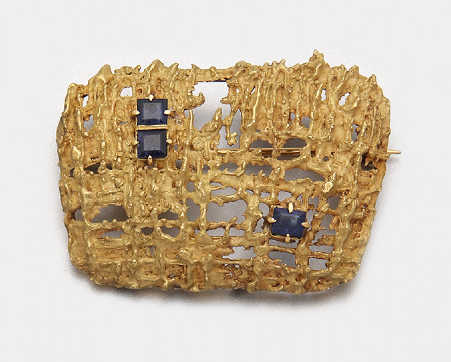 Vintage Brosche mit Saphiren aus den 60er Jahren Gelbgold, gest. 750. In Ajour gearbeitete Kissenform, schauseitig mit drei nahezu kornblumenblauen Saphiren von zus. ca. 0,50 ct. besetzt. Sehr feine Goldschmiedeausführung. Gew. ca. 9,93 g.